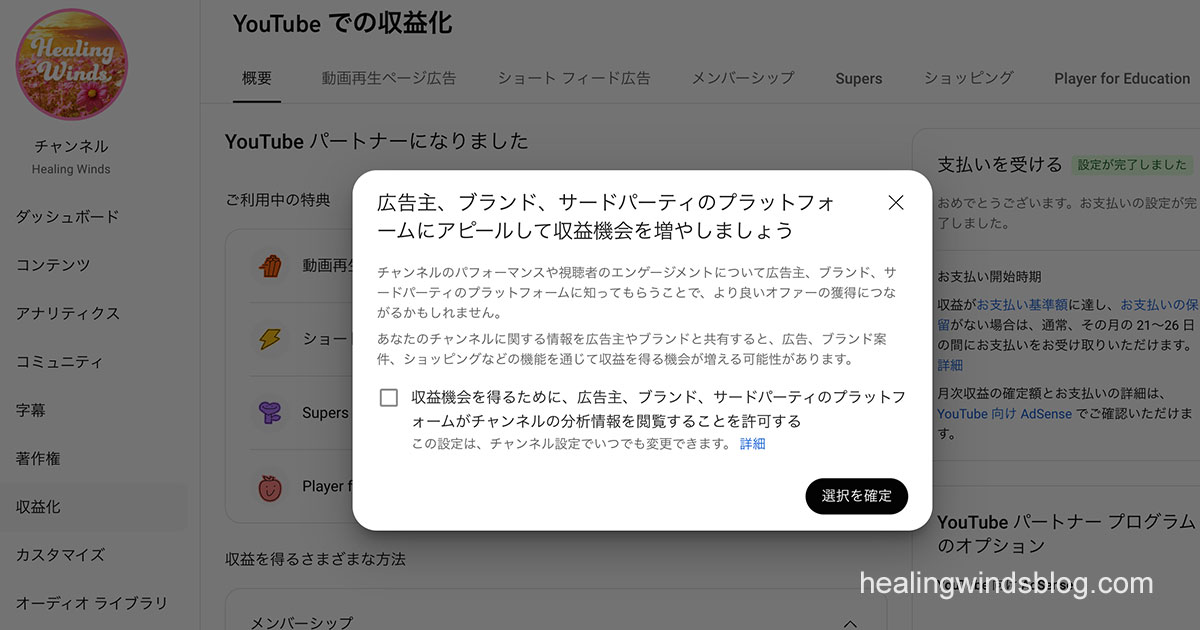 Healing Windsは、ブランド案件や、アフィリエイト収益が直接増えるようなタイプのチャンネルではないため、この設定をオンにする必要はありませんでした。